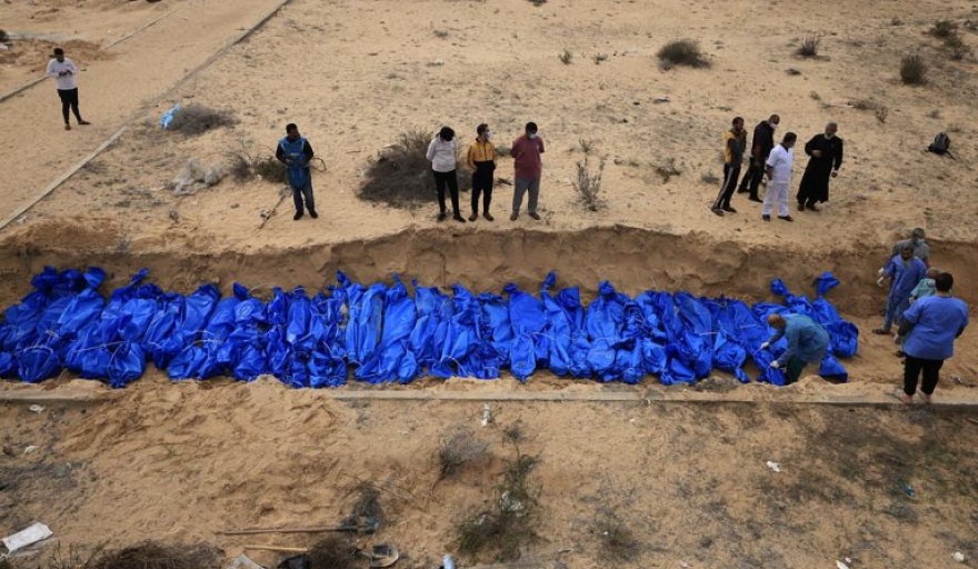Entierro en una fosa común de palestinos muertos por bombardeos israelíes en el cementerio de Khan Yunis .