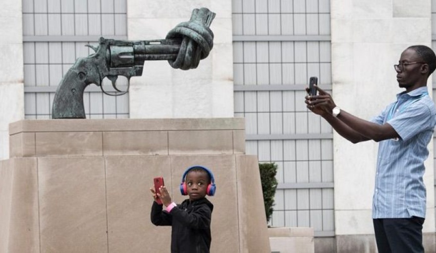 Un hombre y su hijo en la escultura 'No violencia' de la ONU en Nueva York | Foto de ONU/Kim Haughton