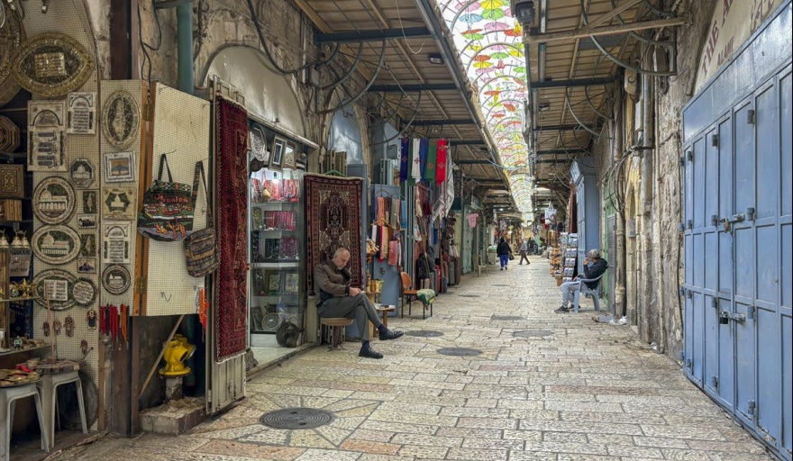 Es Semana Santa y la Ciudad Vieja de Jerusalén está prácticamente vacía por el impacto de la guerra en la Franja de Gaza: tiendas con pocos clientes y pocos peregrinos, mientras los palestinos cristianos, muchos residentes en Cisjordania, no han obtenido permisos para visitar la ciudad santa. Algunas tiendas tienen el cerrojo echado, también por ser el mes de Ramadán, y los vendedores hojean el periódico o toman café mientras gritan a los pocos turistas que pasean por la calle para que les compren algo. EFE/ Jorge Dastis