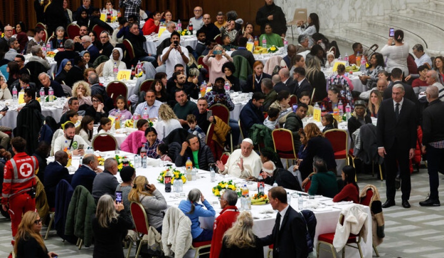 Entre los invitados al almuerzo numerosos refugiados y desplazados de distintos países que se alojan en el Centro Astalli, una organización jesuita que se ocupa de esta gente en 57 países del mundo. También estuvo presente Giuseppe, un vagabundo sin residencia que hace algunos días recibió como regalo unos zapatos que el Papa Francisco había recibido a su vez como regalo algunos días atrás. El vagabundo había dicho a los que lo ayudaban que no podía caminar más con los destruidos zapatos que tenía.