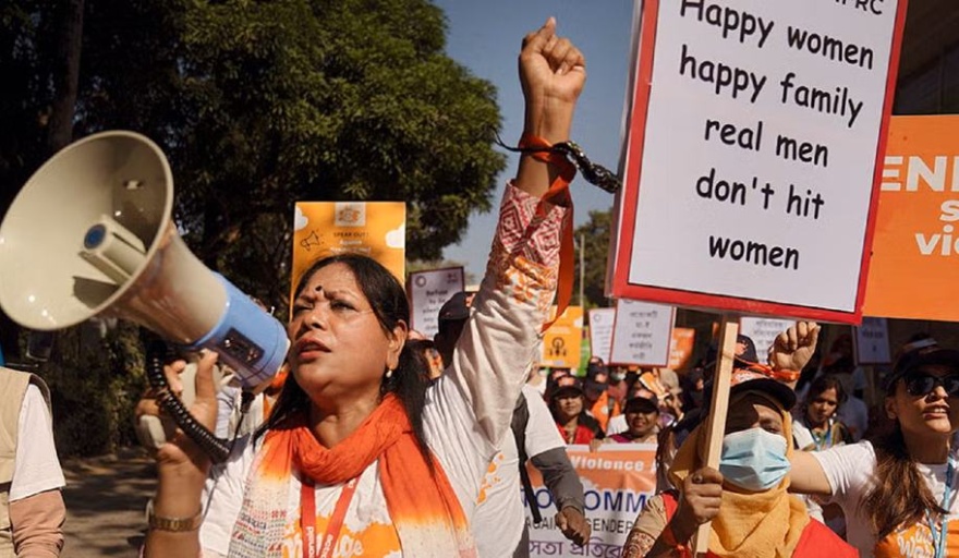 Activistas se manifiestan en Cox's Bazar, Bangladesh, portando pancartas en protesta por la violencia sexual y de género