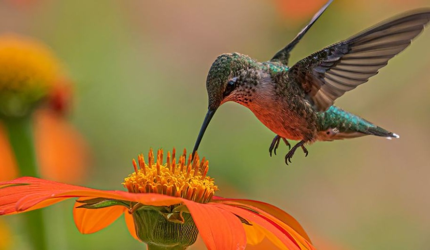 Unsplash/Dulcey Lima. Un colibrí revoloteando sobre una flor naranja en Estados Unidos.