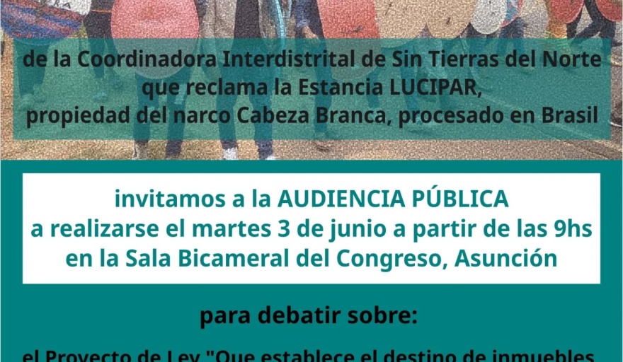 La Actividad busca recaudar fondos a fin de cubrir el traslado de referentes campesinos hasta la capital para participar de la Audiencia Pública para debatir sobre el Proyecto de Ley «Que establece el destino de inmuebles rurales y urbanos sujetos a la ley nº 5876 ‘de administración de bienes incautados y comisados’ y deroga la ley N° 6396/19», organizada por el Senado. La audiencia está prevista para el martes 3 de junio a partir de las 9hs en la Sala Bicameral del Congreso, Asunción.