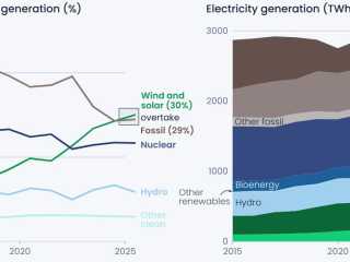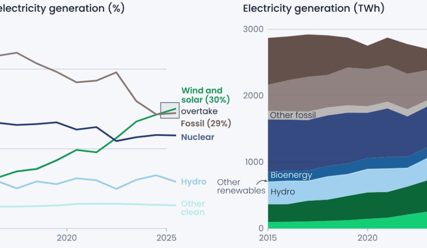 En 2025, considerando en conjunto los 27 Estados miembros de la Unión Europea (UE), el volumen de electricidad producida a partir de fuentes eólicas y solares superó al de la electricidad producida a partir de fuentes fósiles. Se trata, respectivamente, del 30 % y el 29 % de la producción eléctrica, según los datos agregados del informe.