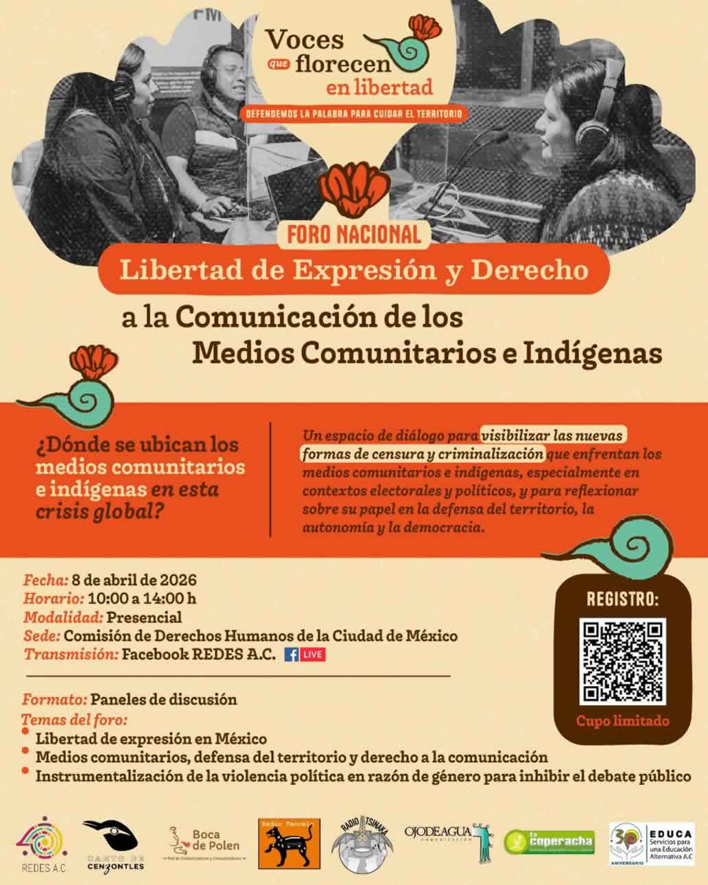 El miércoles 8 de abril se celebrará en la Comisión de Derechos Humanos de la Ciudad de México, el Foro Nacional sobre Libertad de Expresión y el Derecho a la Comunicación de los Medios Comunitarios e Indígenas, convocado por las organizaciones y medios comunitarios REDES AC, Canto de Cenzontles, Boca de Polen, Radio Teocelo, Ojo de Agua Comunicación, Radio Tsinaka, EDUCA Oaxaca y La Coperacha.
