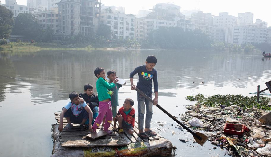UNICEF/Jannatul Mawa.- Niños cruzando un lago contaminado en una balsa casera en Dhaka, Bangladesh.